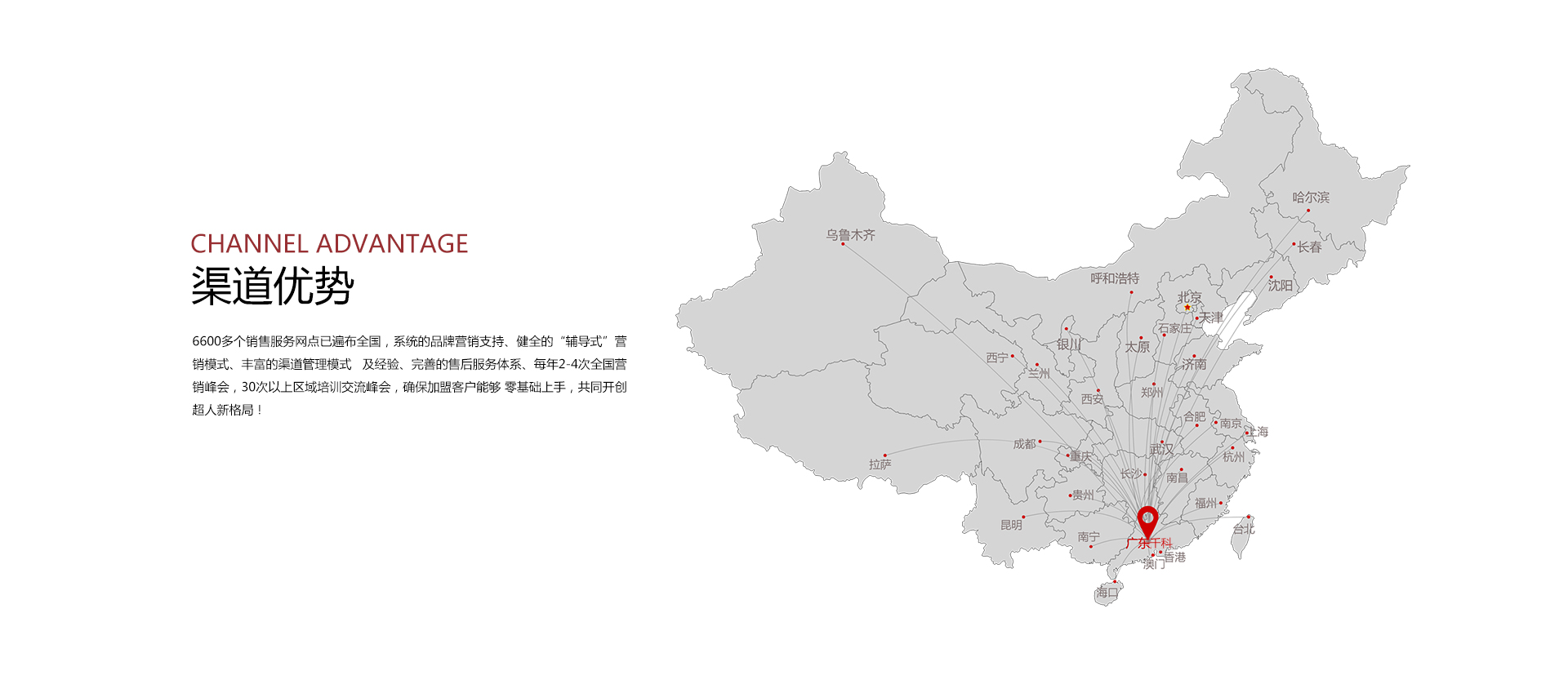6600多個銷售服務網點已遍布全國,系統的品牌營銷支持、健全的“輔導式”營銷模式、豐富的渠道管理模式 及經驗、完善的售后服務體系、每年2-4次全國營銷峰會,30次以上區域培訓交流峰會,確保加盟客戶能夠 零基礎上手,共同開創超人新格局!