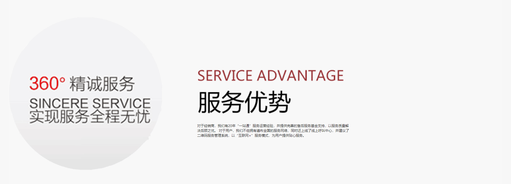 對于經銷商,我們有20年“一站通”服務運營經驗,并提供完善的售后服務基金支持,以服務質量解決后顧之憂。 對于用戶,我們不但擁有遍布全國的服務網絡,同時還上線了線上呼叫中心,并建議了二維碼服務管理系統,以“互聯網+”服務模式,為用戶提供貼心服務。