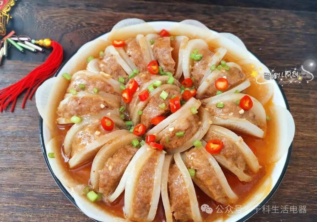 3.將白蘿卜豎著對半切開,然后切成頂部切下底部相連的蘿卜夾。將肉餡放入蘿卜夾中,用勺子抹平,裝盤,做成花狀。